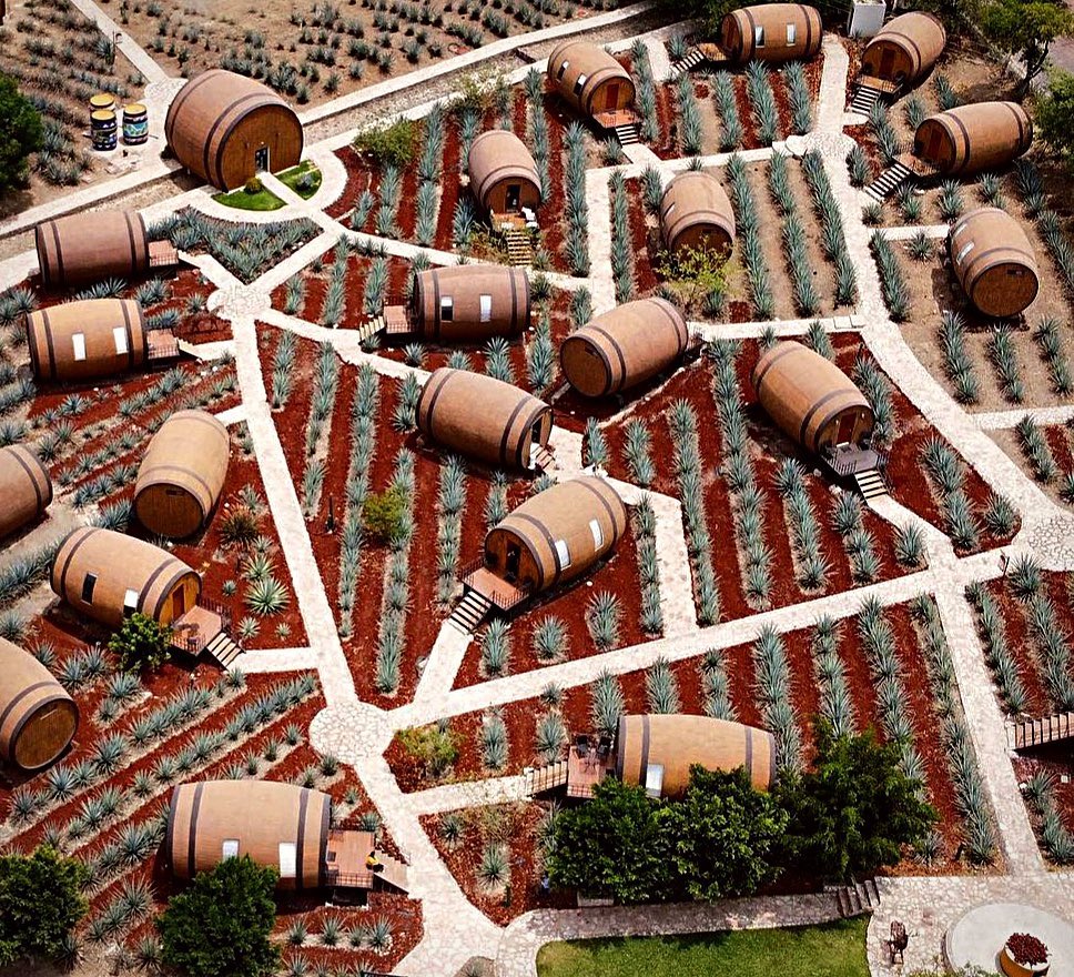 Habitación con 2 camas dobles. La estructura es la de un barril, tiene terraza y está en medio de un campo de agave.